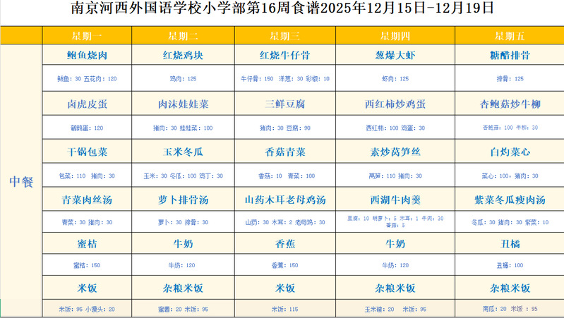 南京河西外国语学校小学部2025-2026第一学期第16周食谱2025.12.15-12.19