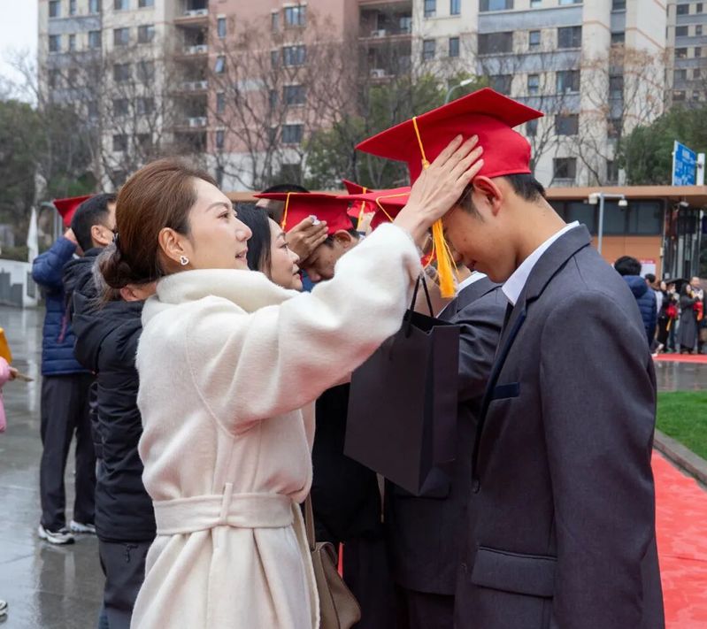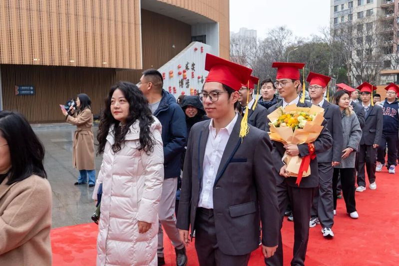 仪式现场,一条长长的红毯从广场铺向象征成长的“成人门”。在父母老师的陪伴下,高三学子们身着正装,头戴成人帽,腕系红丝带,昂首阔步,迈向人生的新阶段。老师们则纷纷举起手机,记录下孩子们褪去青涩、意气风发的关键一刻。