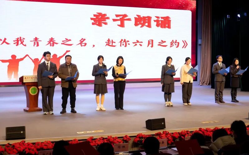 在亲子朗诵环节,家长与学生代表并肩而立,用声音演绎着两代人的牵挂与感恩。一句“感谢你们清晨6点的守候”,道出了无数学子的心声;一句“我们愿做托举的风”,则是父母最深情的告白。