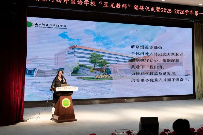 2026年2月6日,南京河西外国语学校“首届星光教师表彰仪式暨2025-2026学年第一学期期末全体教职工大会”隆重举行。大会以“奋楫笃行收硕果,星河逐梦启新程”为主题,旨在表彰先进、凝聚共识,共绘学校高质量发展新蓝图。