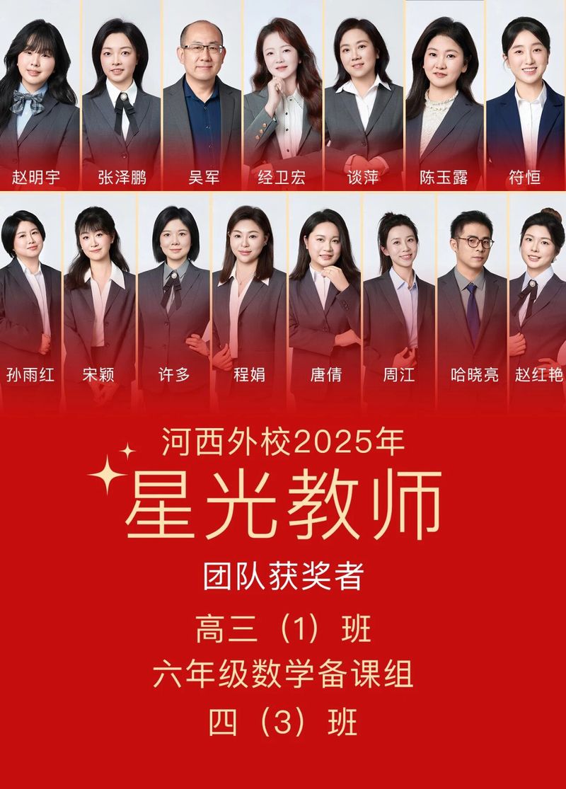 同时,大会表彰了三个卓越的“星光团队”:高三1班教师团队、六年级数学备课组、四(3)班教师团队。这些团队在毕业班攻坚、学科建设与班级育人等方面成绩斐然,展现了河外教师卓越的协作精神与战斗力。