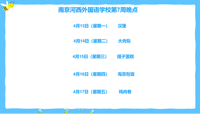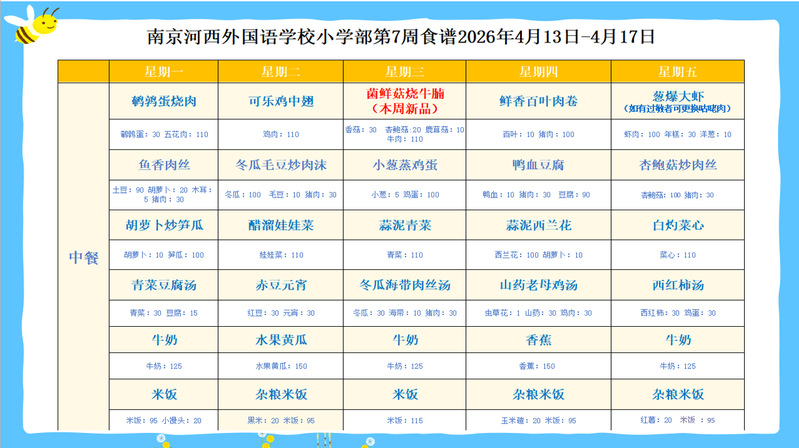 南京河西外国语学校小学部2025-2026第二学期第7周食谱+晚点2026.4.13-2026.4.17