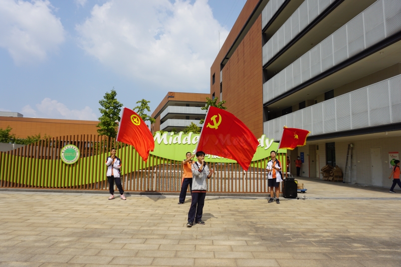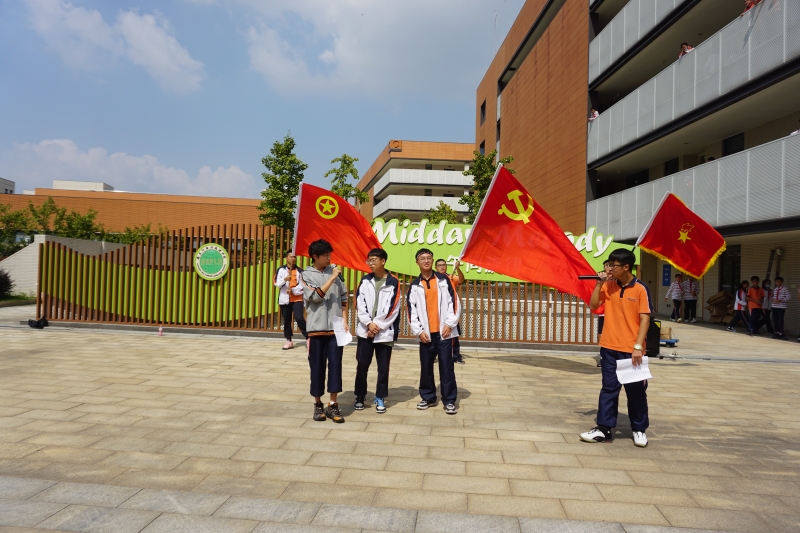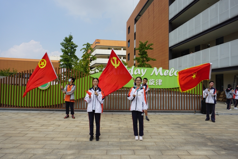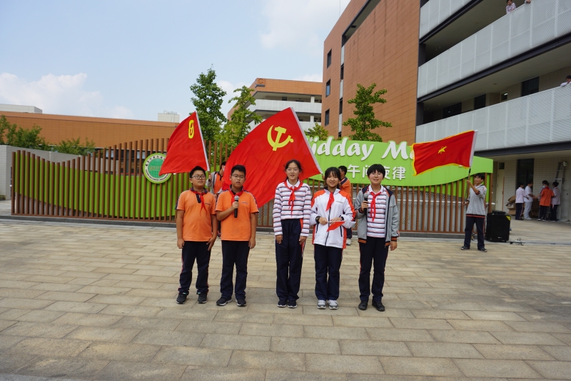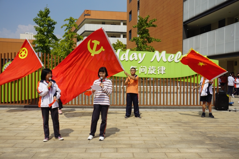 9月30日中午,二楼平台午间旋律处,同学们一起唱歌、欢呼,原来是南京河西外国语学校的午间旋律之国庆特辑开始了!初一年级:《我和我的祖国》、初二年级《红旗飘飘》、高一年级的《腾云》、《她》、《龙文》一首首耳熟能详的歌曲在耳边回荡,唱出了同学们对祖国的爱。