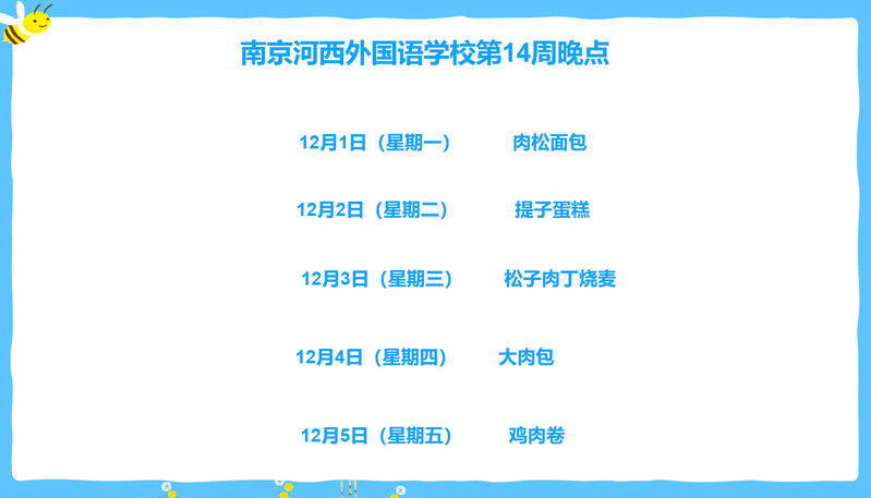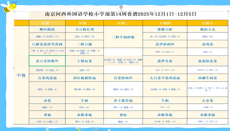 南京河西外国语学校小学部2025-2026第一学期第14周食谱+点心2025.12.1-2025.12.5