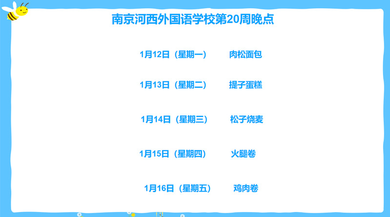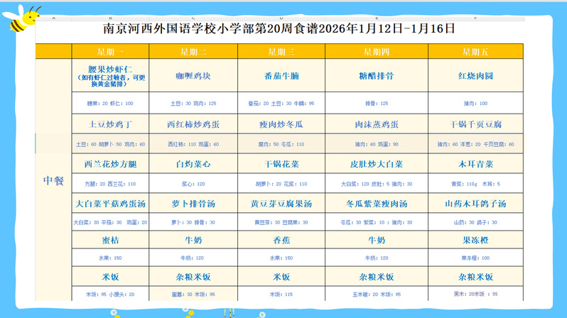 南京河西外国语学校小学部2025-2026第一学期20261.12-1.16 食谱+晚点
