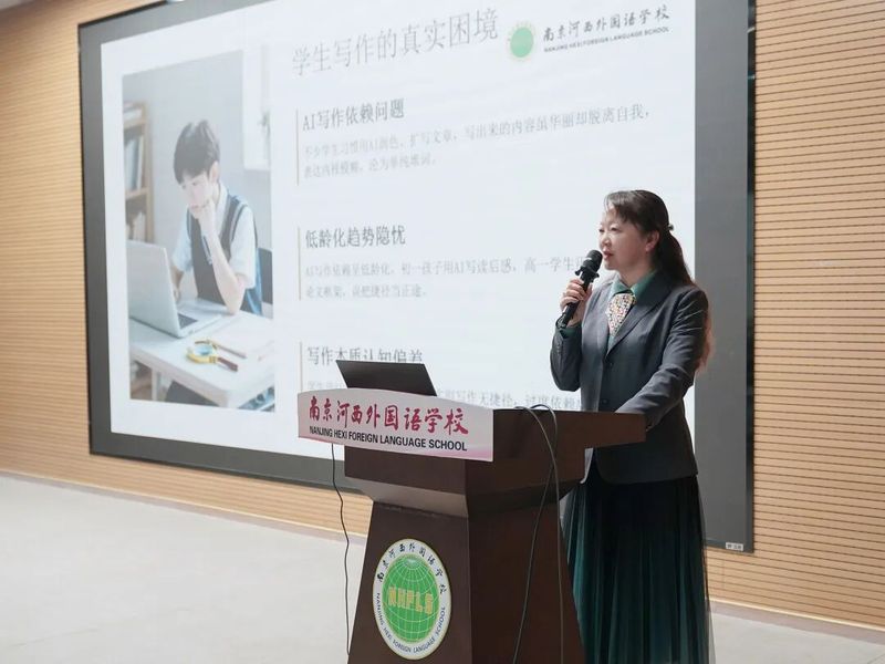 南京河西外国语学校党总支书记、正高级教师经卫宏老师,作了题为《在技术奔涌处,深挖思想的河床》的专题讲座。她认为学生写下观点被反驳、咬笔修改表述、被追问语塞的瞬间,是真正的学习时刻,这些“慢写作”“笨功夫”“思维打架”需要我们教师呵护与引导,不可交给AI喂养。