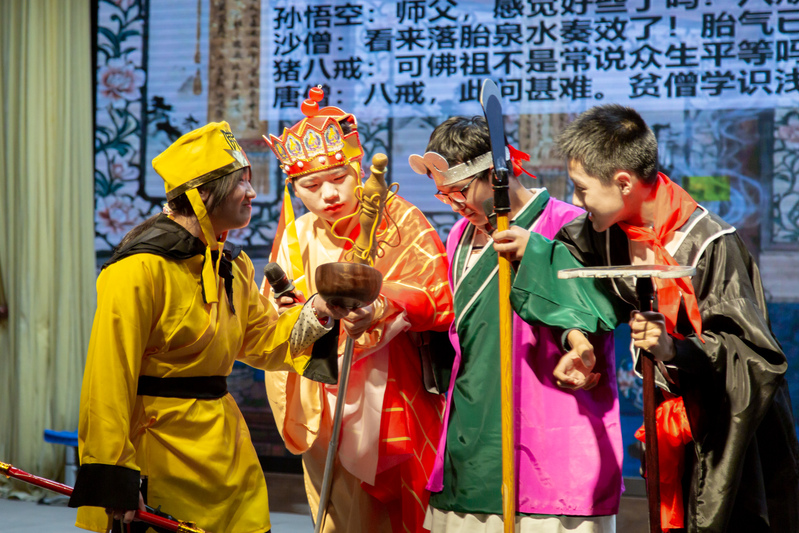 初二年级专场汇演节目形式多样、内涵丰富,6个精品节目精彩纷呈。初二1班率先带来话剧《西游记之女儿国》,精准还原经典名著桥段,将西行路上的趣味奇遇搬上舞台,流利的双语台词让经典名著在双语舞台上趣味横生。